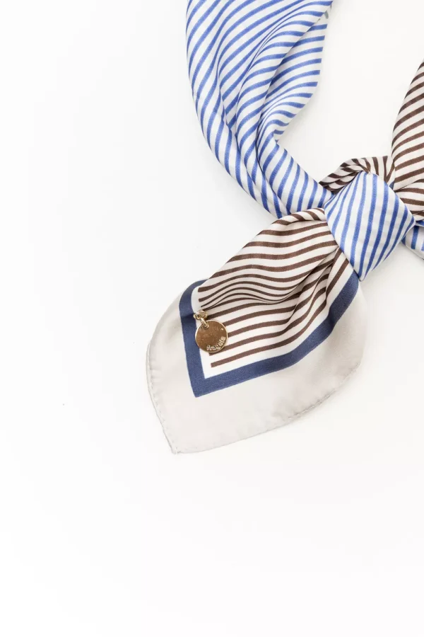 Κομψό σατέν φουλάρι με πολυτελές σχέδιο σε αποχρώσεις του λευκού, γκρι και μπλε, διακοσμημένο με χρυσές λεπτομέρειες ιππικής έμπνευσης. Απαλό και λαμπερό, προσθέτει φινέτσα σε κάθε εμφάνιση.