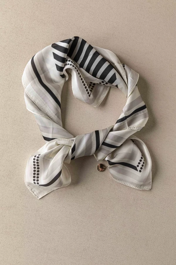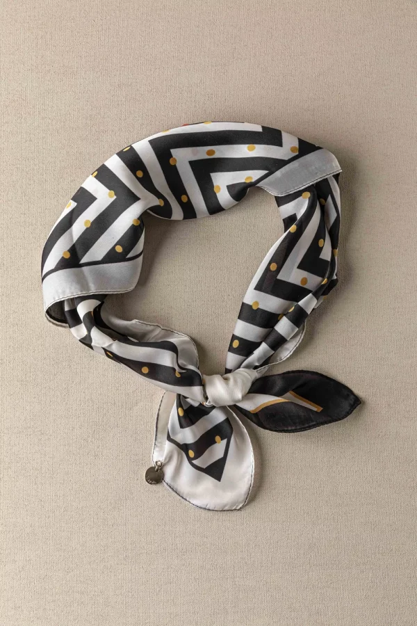 Κομψό σατέν φουλάρι με μοντέρνο γεωμετρικό σχέδιο σε αποχρώσεις του λευκού, γκρι και μαύρου. Διατίθεται και σε μπλε χρώμα. Ιδανικό για elegant εμφανίσεις, προσθέτει στυλ και φινέτσα σε κάθε ντύσιμο.