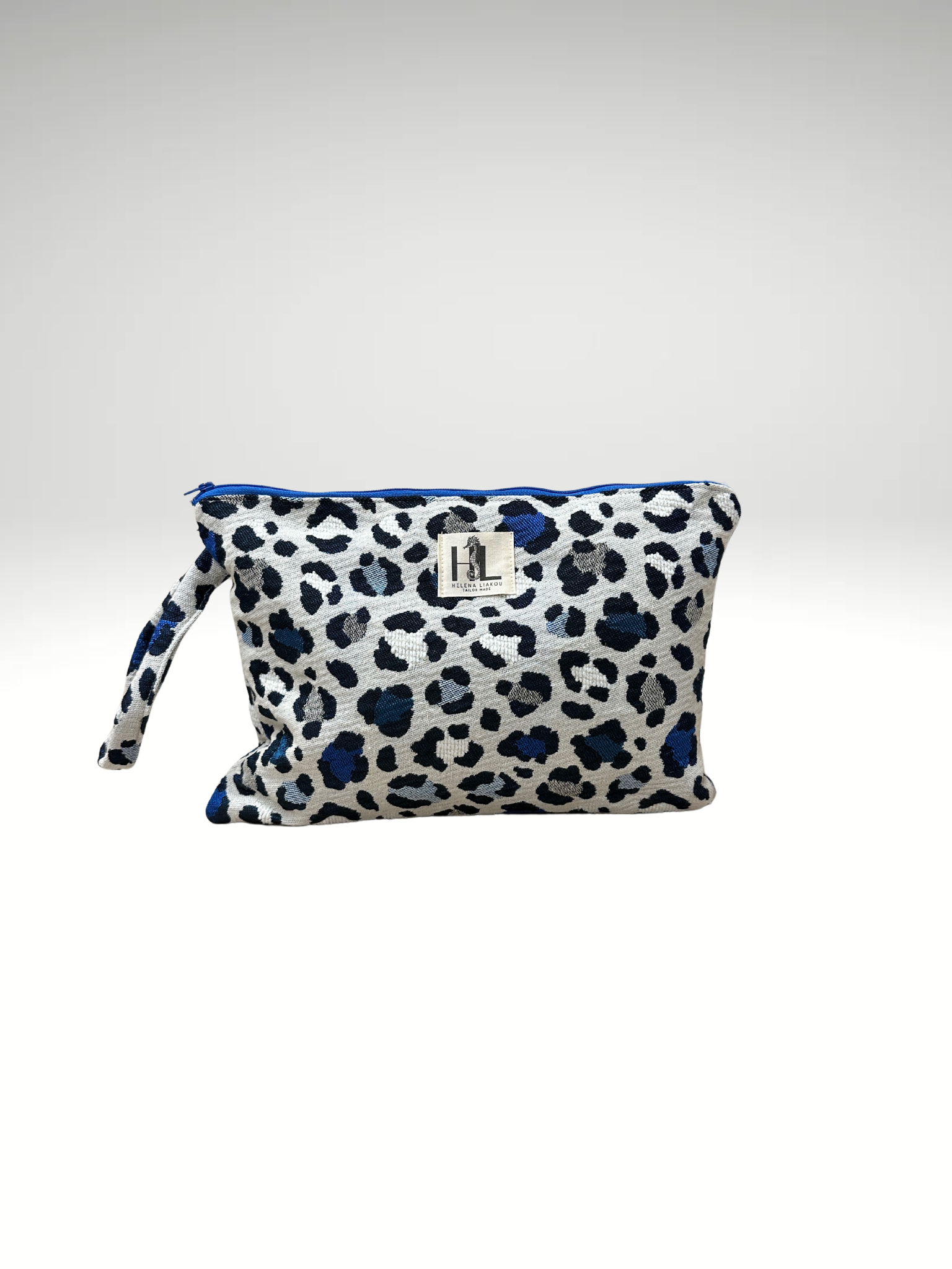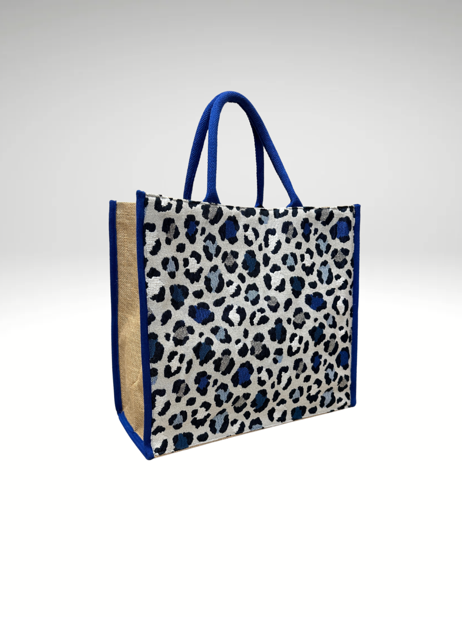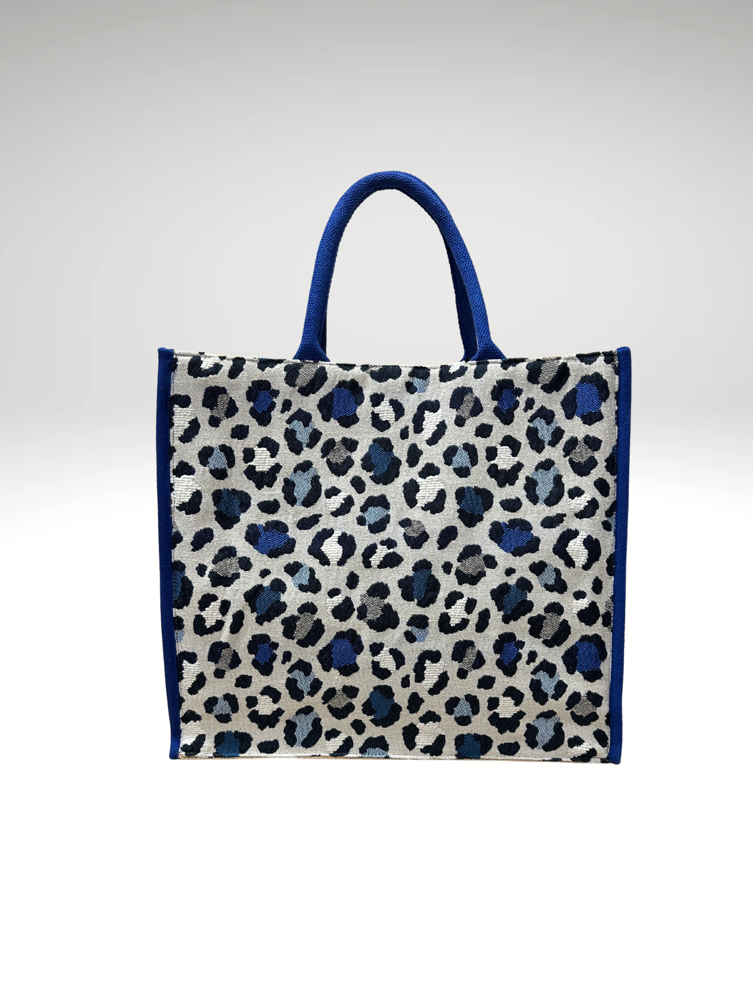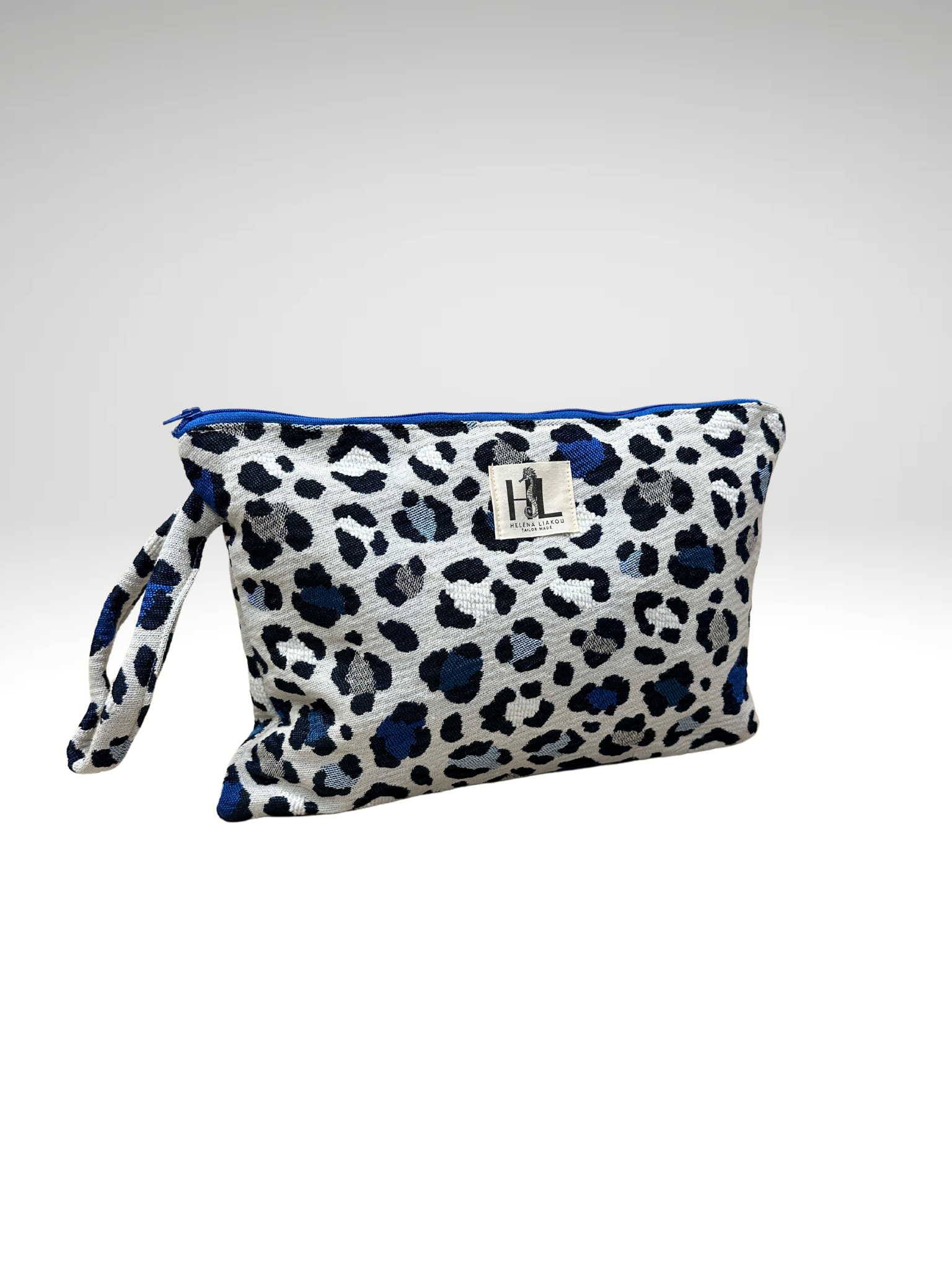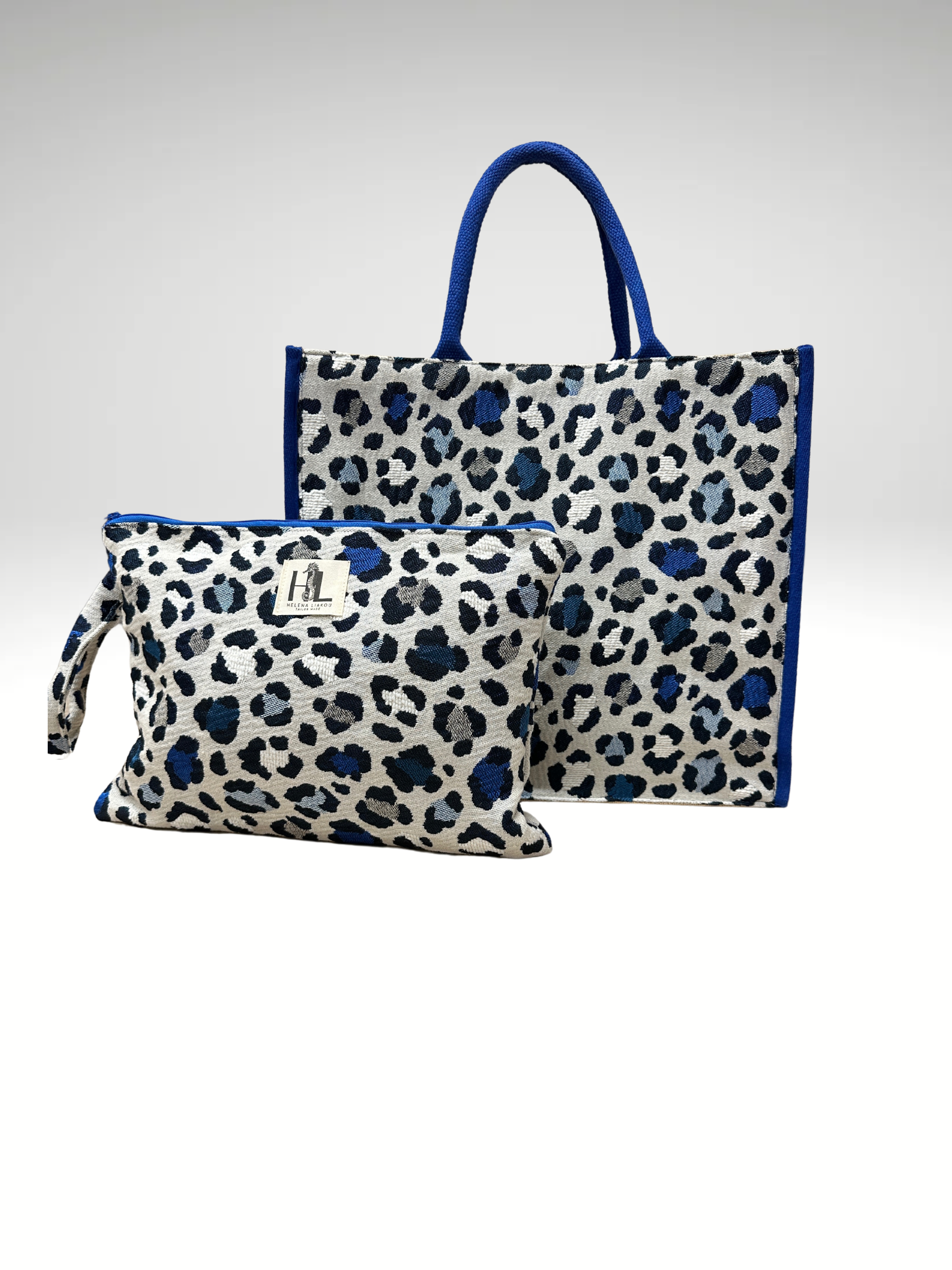 Σετ τσαντών παραλίας από καραβόπανο και αδιάβροχο ύφασμα, αποτελούμενο από μεγάλη τσάντα και νεσεσέρ. Διαθέτει μοντέρνο animal print σε μπλε και μαύρες αποχρώσεις, με μπλε λαβές για κομψότητα και πρακτικότητα. Ιδανικό για καλοκαιρινές εξορμήσεις!
